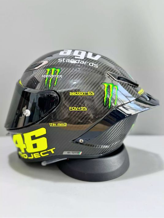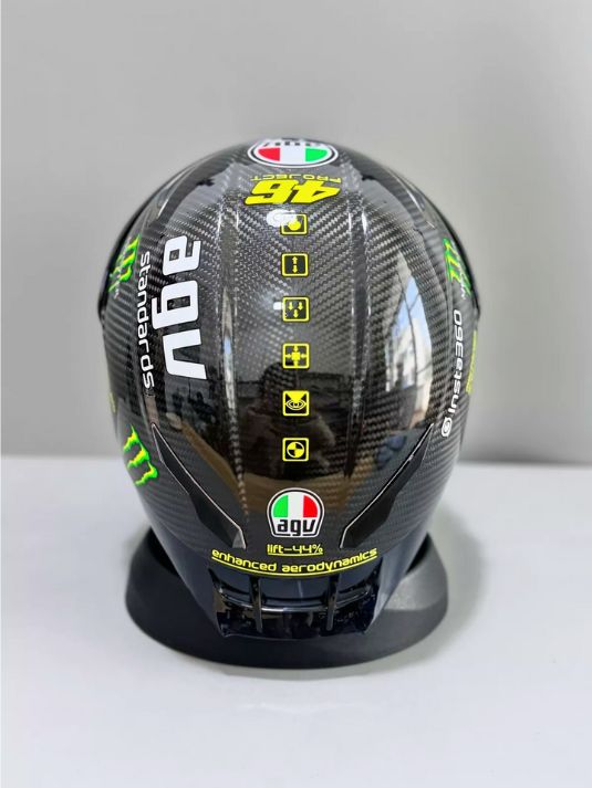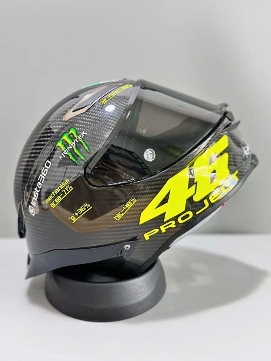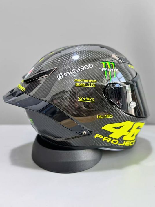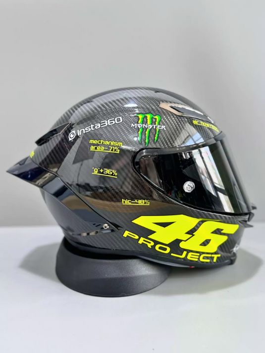 Este casco forma parte del exclusivo "Proyecto 46", diseñado por el legendario piloto de MotoGP Valentino Rossi. Su diseño se inspira en los prototipos de carreras, incorporando tecnología de vanguardia, estilo de fibra de carbono y una estética agresiva que refleja el espíritu de la pista.