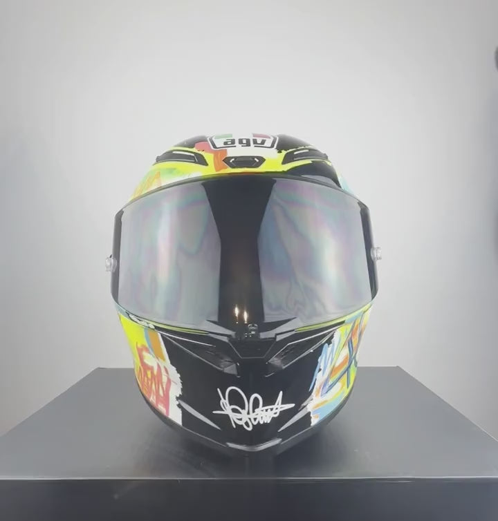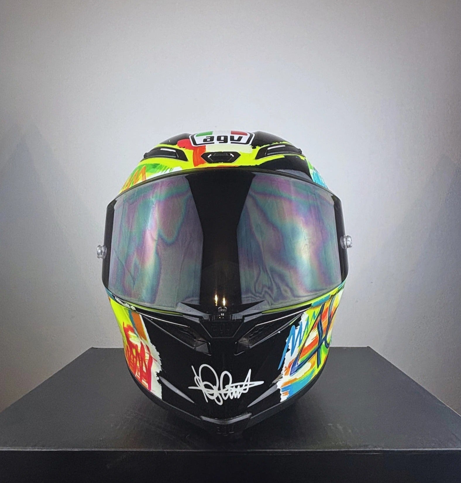 Este diseño combina arte, dinamismo y características emblemáticas del piloto, destacando su estilo único y personalidad vibrante. Este casco especial está inspirado en varios aspectos relacionados con la creatividad, la energía y los elementos que representan a Valentino Rossi tanto dentro como fuera de la pista. Hazte YA con la colección exclusiva de los míticos cascos de Rossi.